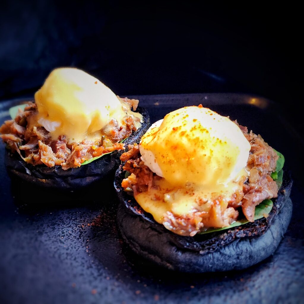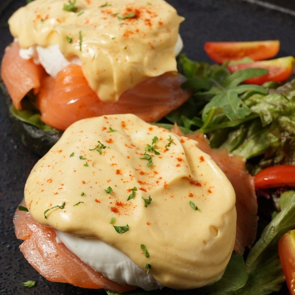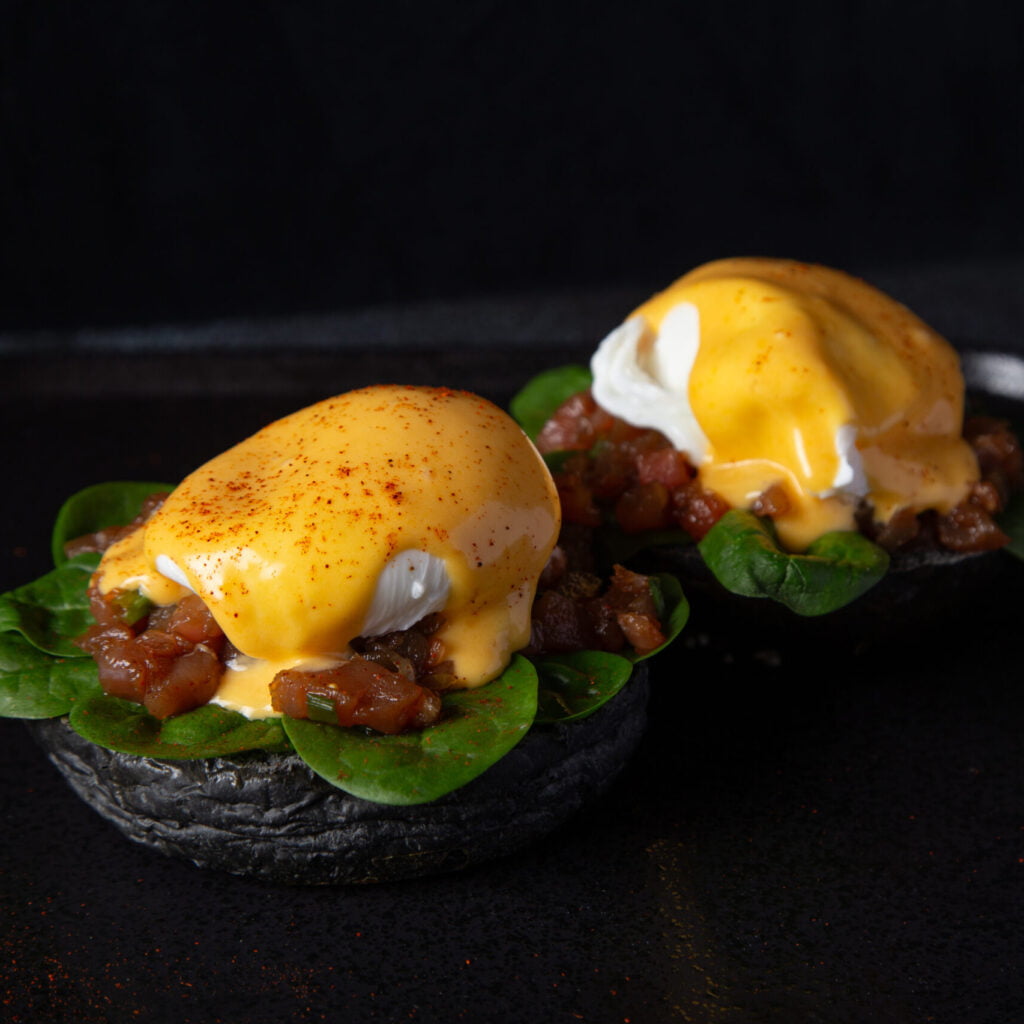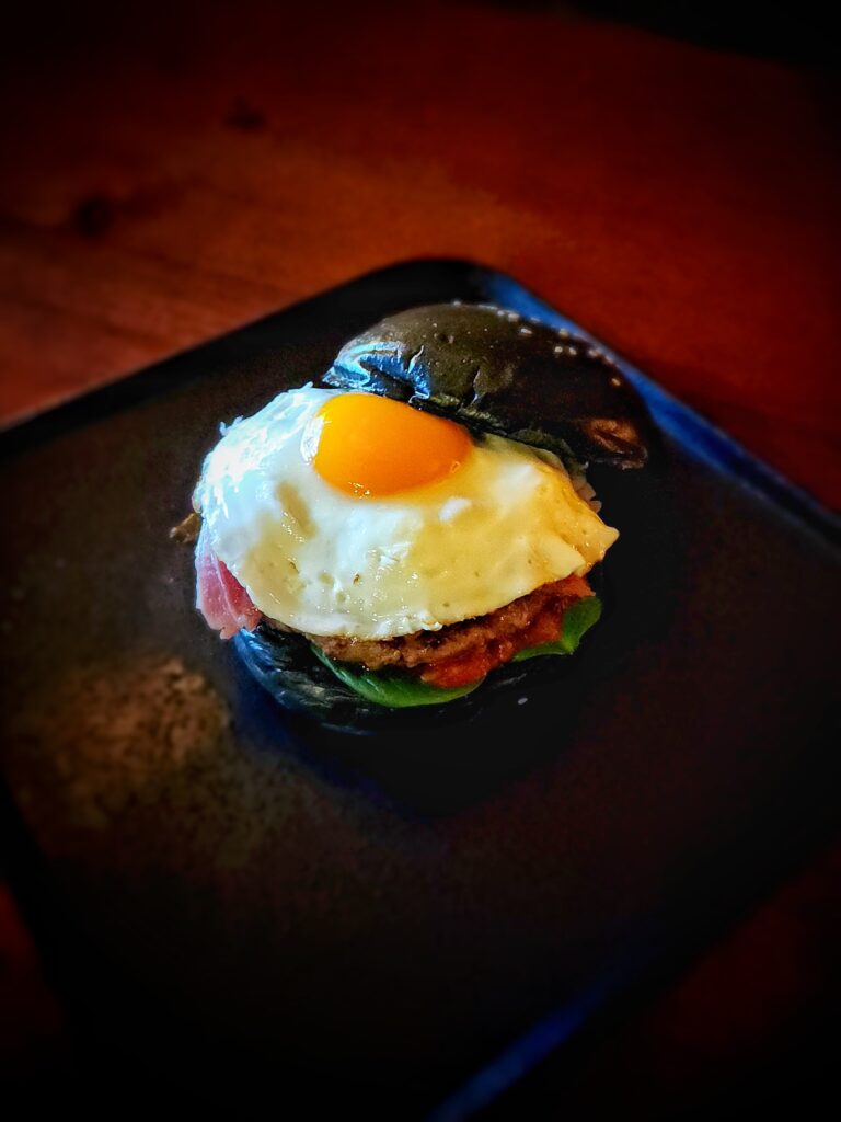 125g Aussie beef patty with hollandaise sauce, bacon and fried egg over baby spinach in a Blacksheep bun.