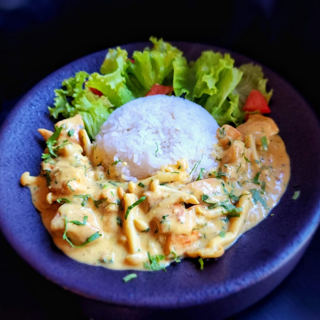 Boneless chicken cooked in creamy coconut sauce with cilantro and mushrooms.