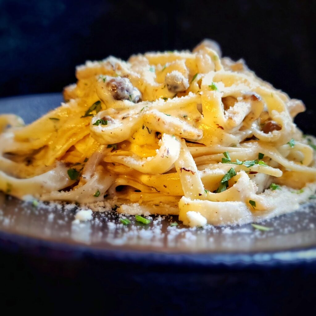 Fettuccini pasta in a creamy Alfredo sauce with Mushroom, Chicken or Squid