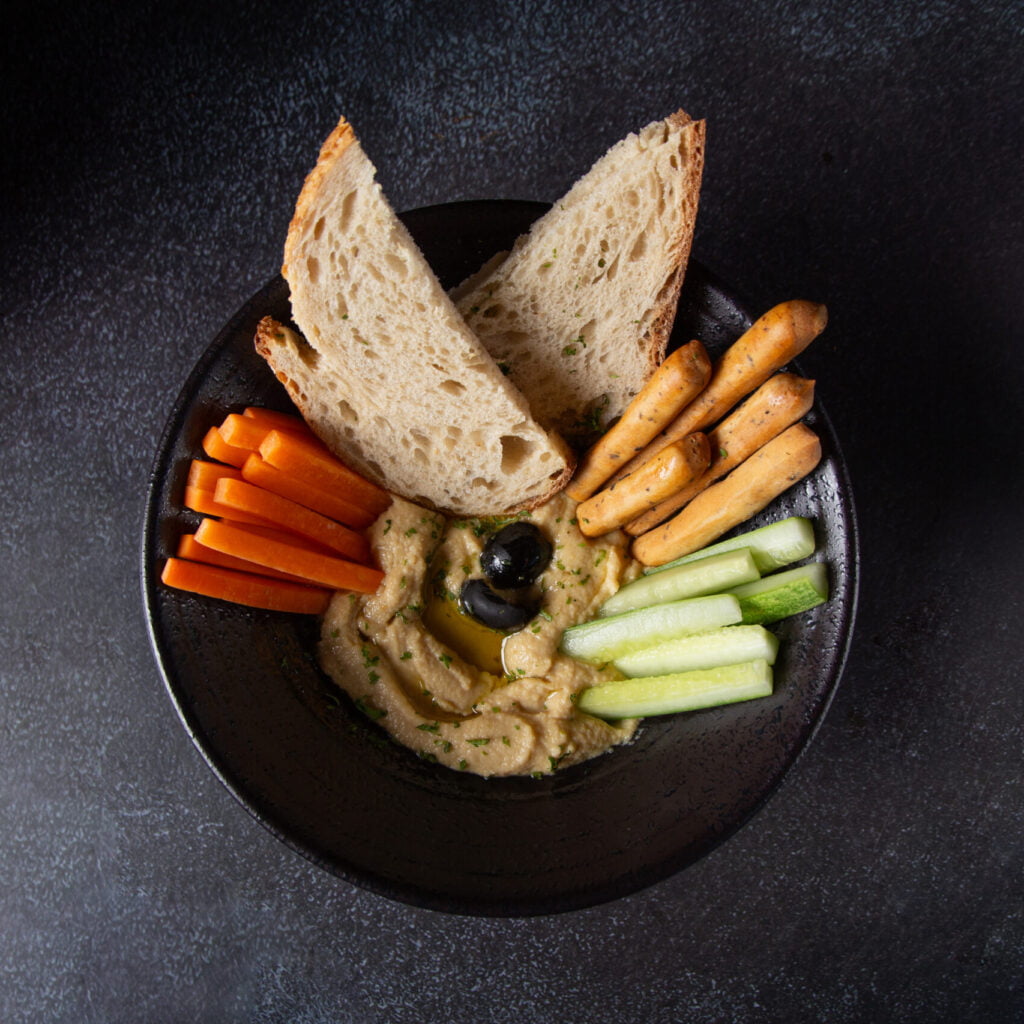 Authentic homemade hummus made from chickpeas and tahini served with carrot sticks and cucumber sticks.