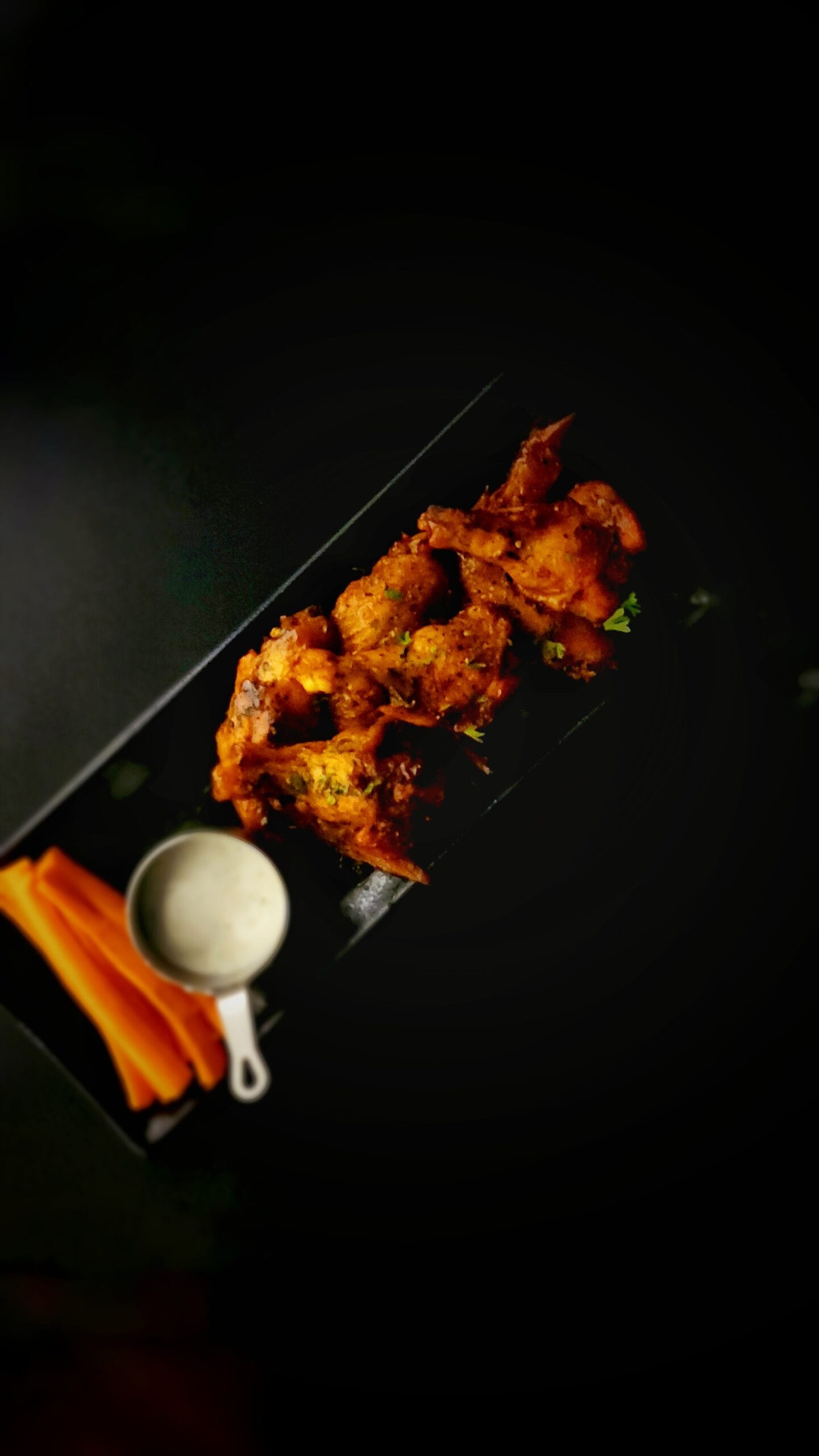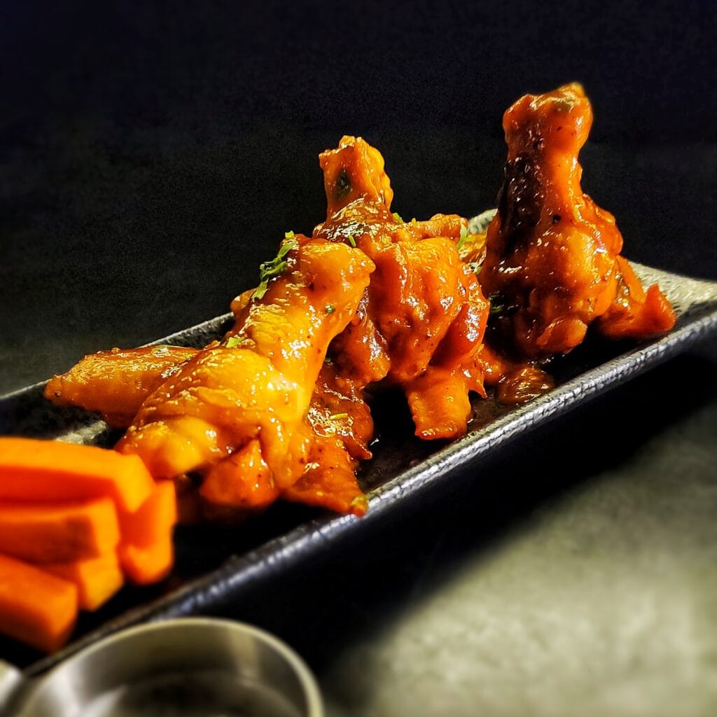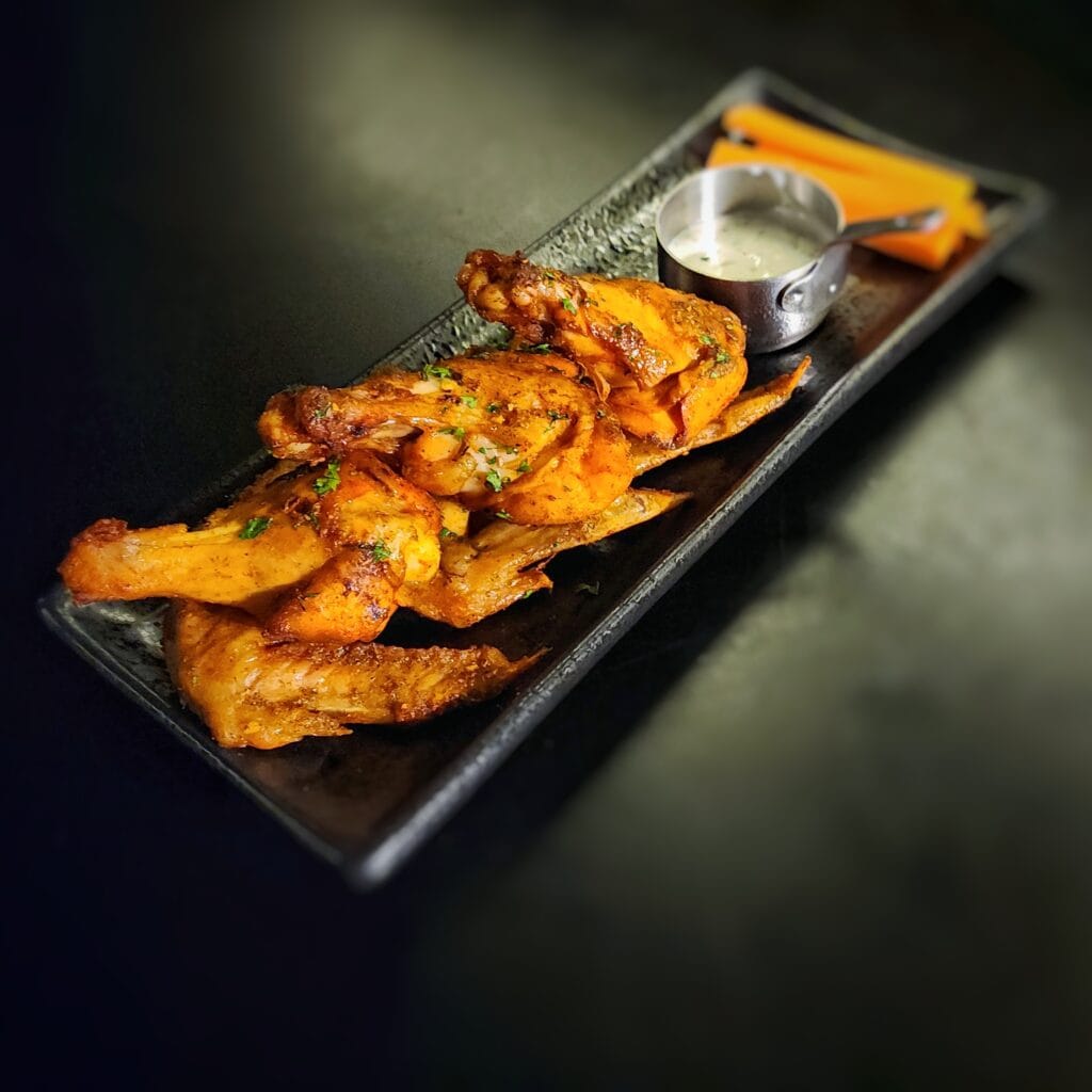 Wings are baked and tossed in fiery tangy chilli & tomato sauce. served w/ herbed yogurt and carrot sticks