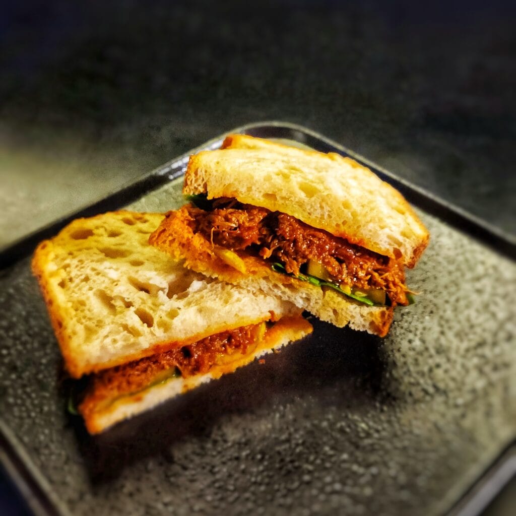12-hour smoked pulled pork is drenched in a bold and spicy habanero barbecue glaze. Served on toasted Sourdough