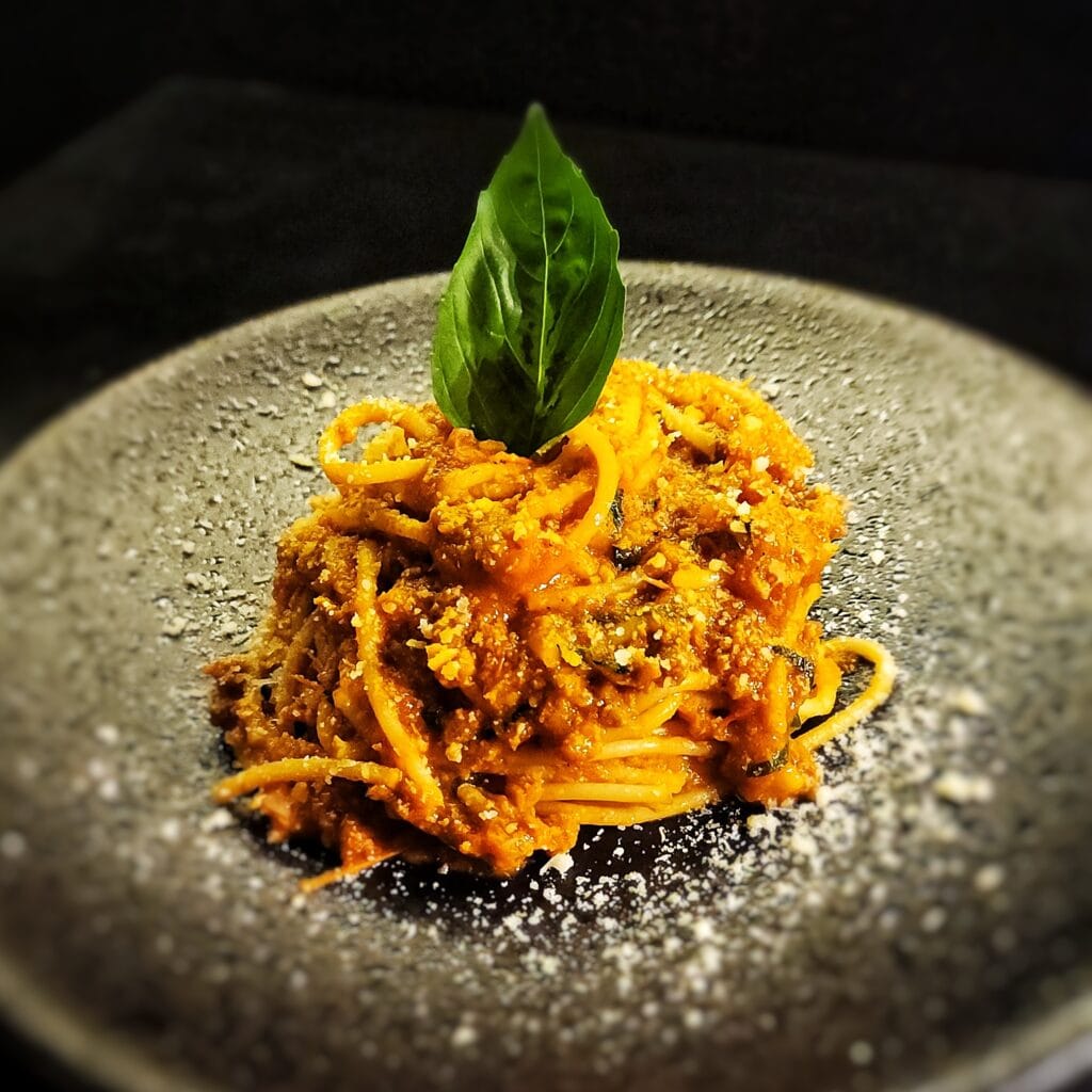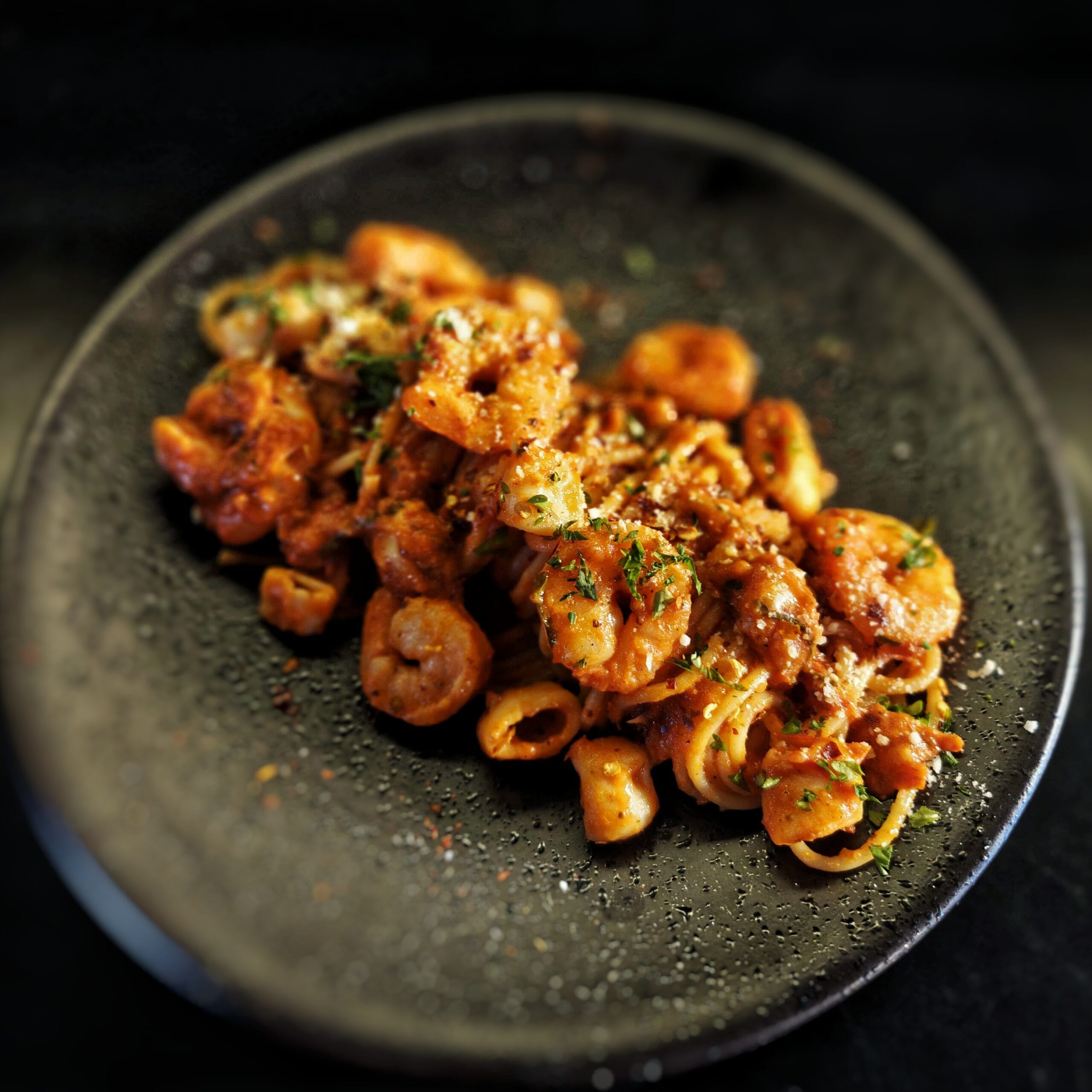 Al dente spaghetti tossed in a spicy tomato sauce with succulent prawns, garlic, and fresh parsley