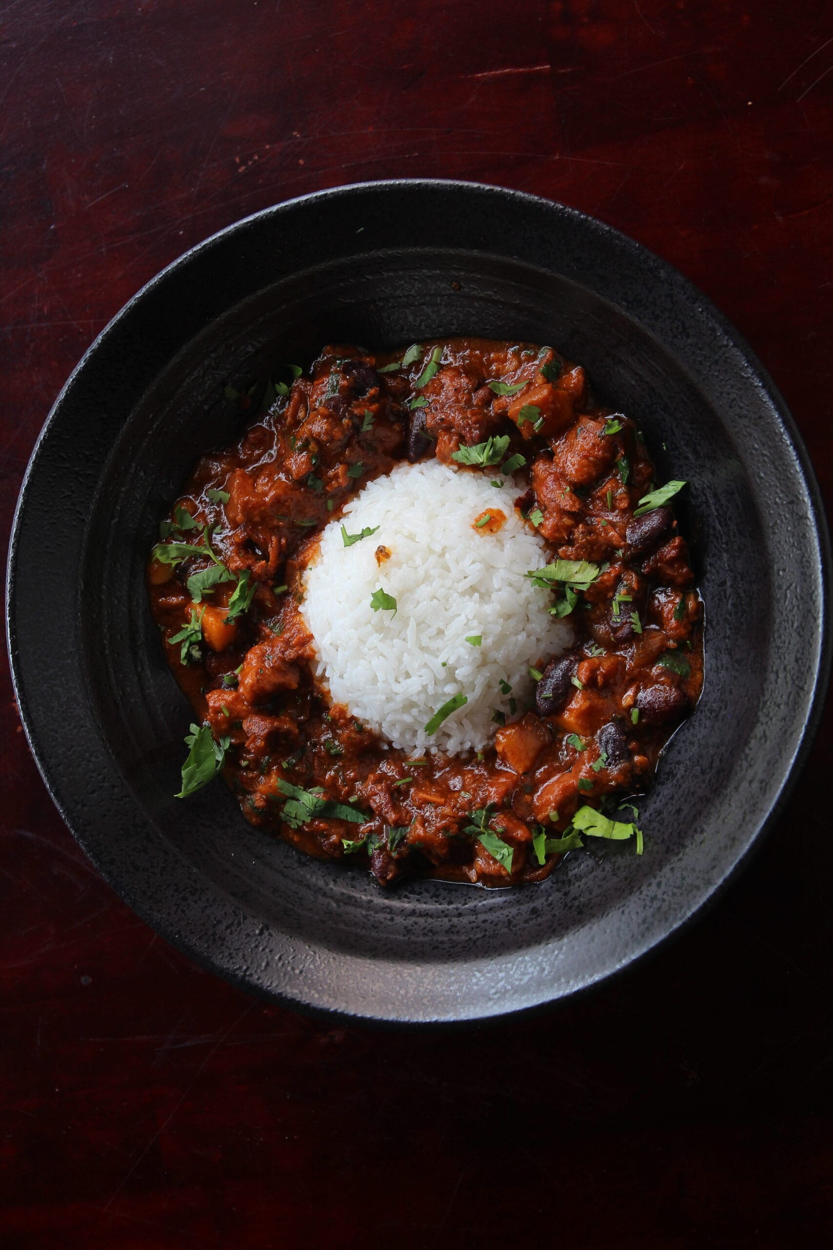 Portuguese-style pork and chorizo stew with kidney beans, served alongside steamed rice as a side.