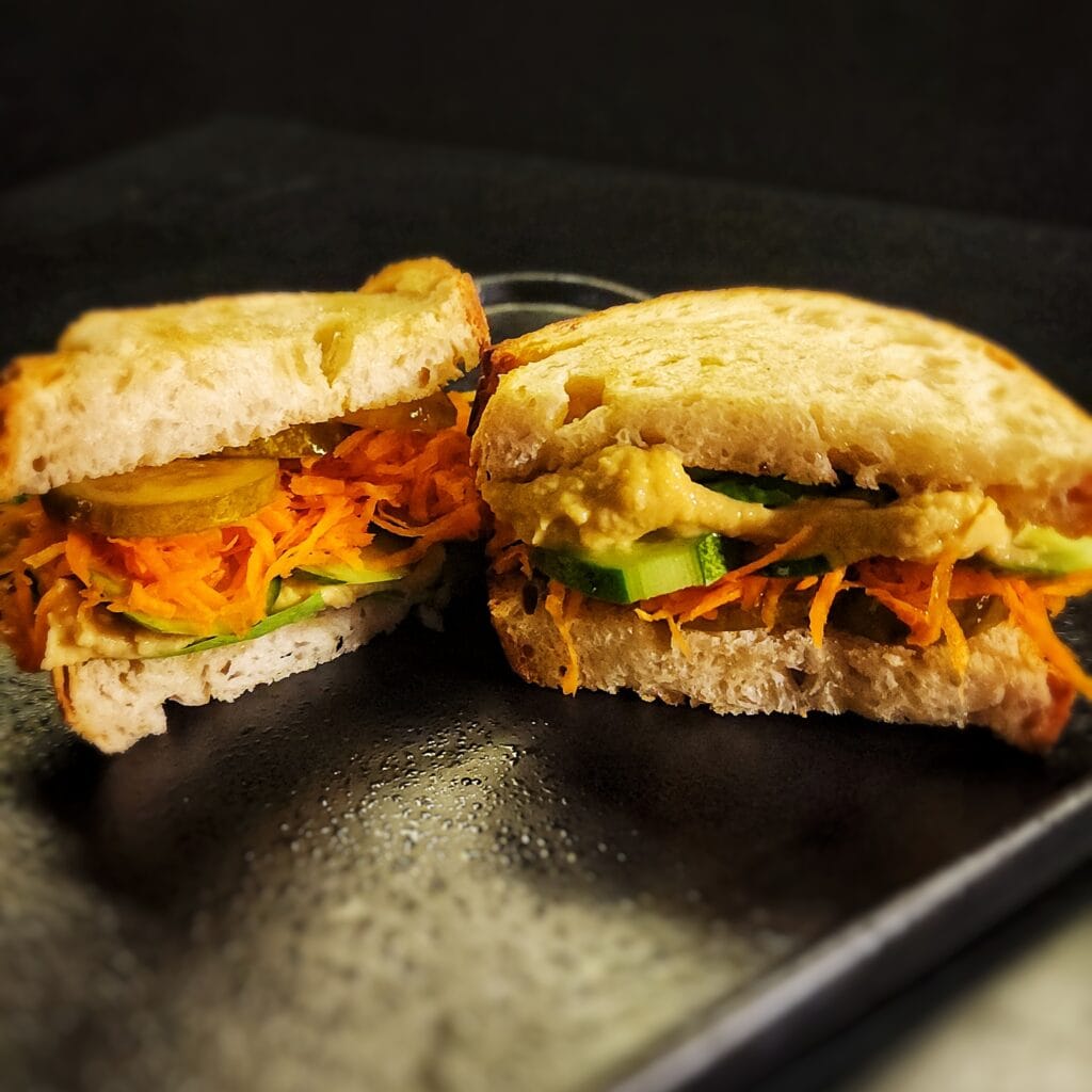 Creamy hummus, fresh spinach, tomato, cucumber, and carrots & pickles. A delicious vegan choice.